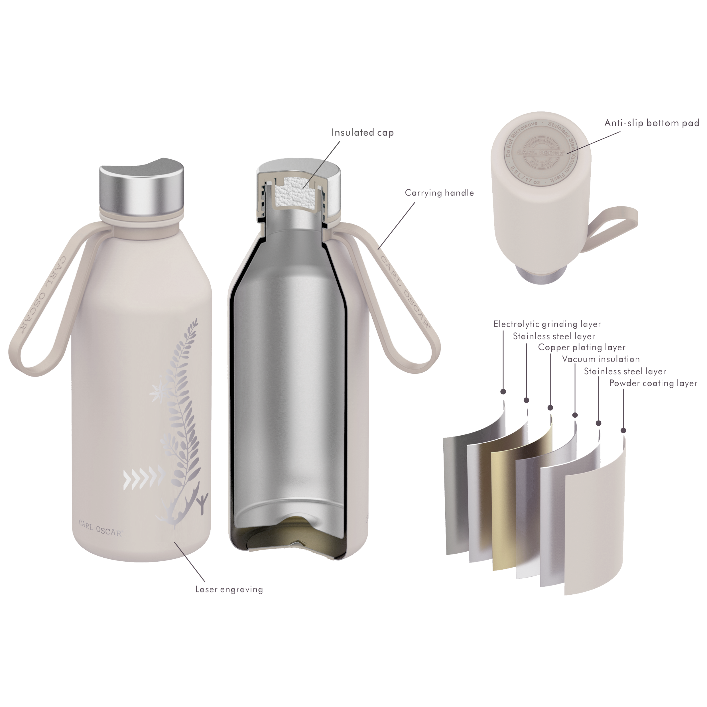 הבקבוק מכיל 0.5 ליטר ובעל דפנות כפולות עם בידוד ואקום.